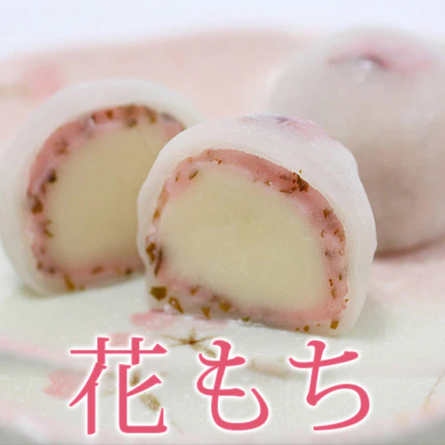 そして花もちは、白あんと桜あんの二重餡をやわらかいお餅で包み、桜の花を一輪添えた大福。見た目にも華やかで、お茶会やお祝いの席のお茶うけにもぴったりの一品です。