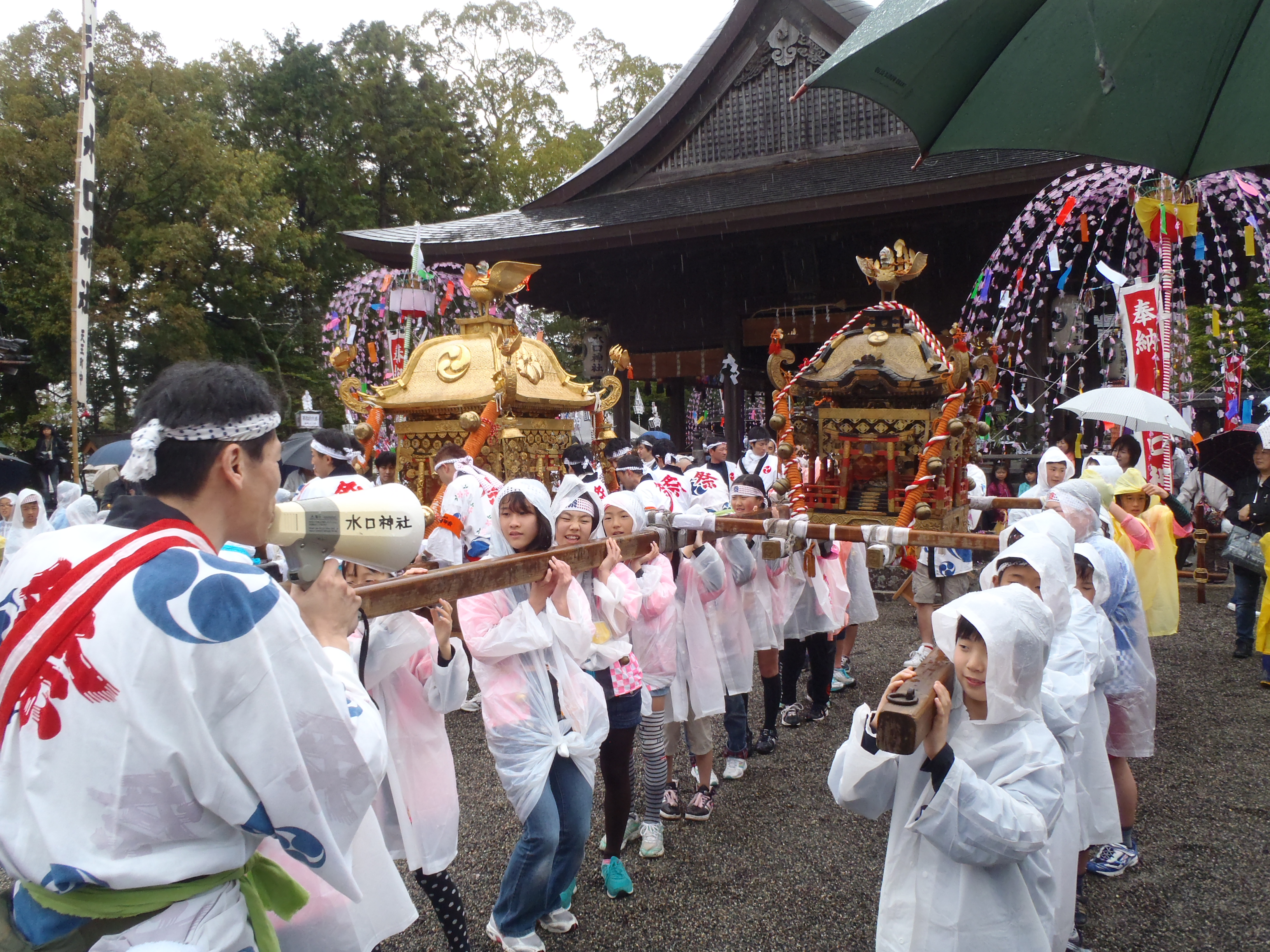 14:00 神輿渡御開始 (曳山奉納の8町が45分ごとに順次水口ばやしを境内で演奏)